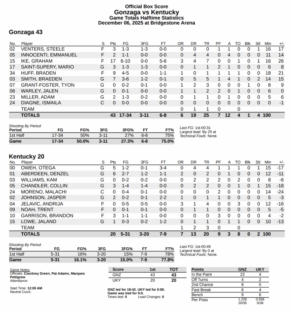 At the first media timeout, Kentucky didn’t have a single point. The Cats finished the half with just five field goals, shooting 16% from the field and 13% from the three-point line. One of those threes came from Brandon Garrison. Is he our most reliable three-point shooter now? I’m only half joking. Meanwhile, Gonzaga is shooting 50% from the floor, with over three times as many buckets (17-34). Denzel Aberdeen leads Kentucky in scoring with six points. Otega Oweh has five. Gonzaga big man Graham Ike has 17. That should tell you exactly how the game is going.