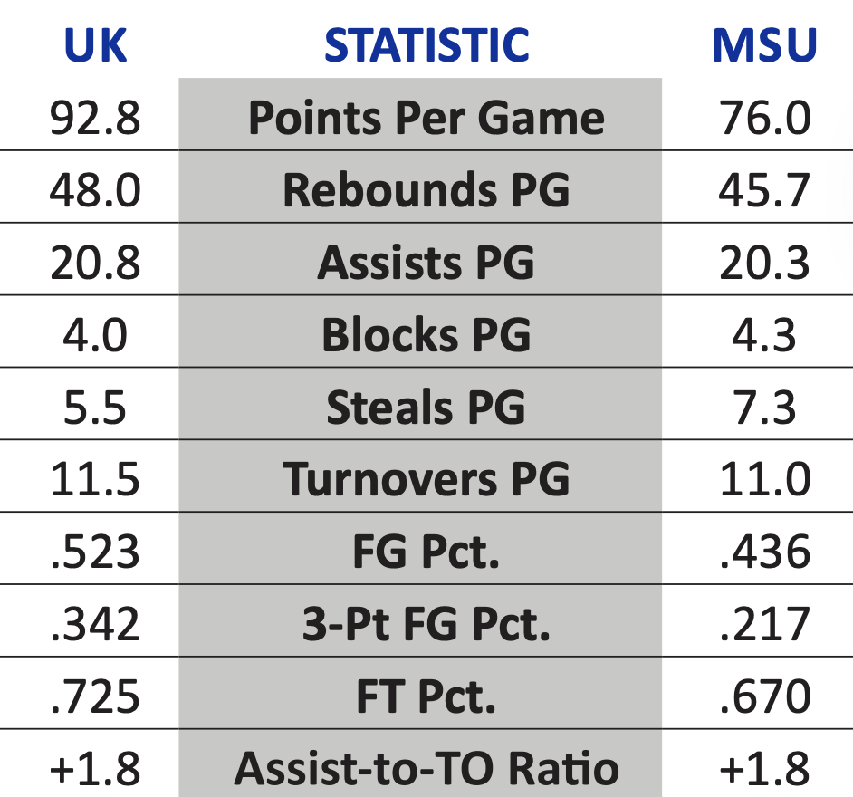 - Kentucky has held three of its four opponents to 60 points or fewer for the first time since 2014-15. The Cats are currently limiting opponents to 34.4% from the field and 26.7% from behind the arc. UK is also pulling down 86.7% of its opponents misses, and owns a +18 margin on the boards.