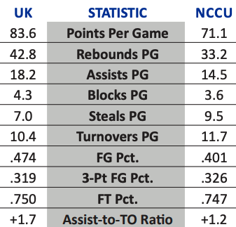 Kentucky and North Carolina Central have never met, making this the third first-time opponent of the season for the Wildcats, joining Nicholls and Eastern Illinois.