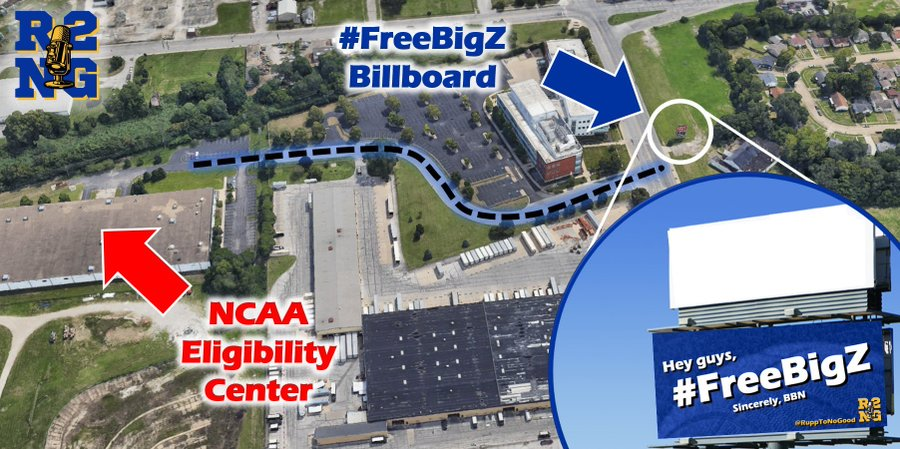 One group of Kentucky fans took the cause to the next level. Their idea? Put up a #FreeBigZ billboard outside of the NCAA Eligibility Center in Indianapolis. The targeted location is directly across the intersection, one within walking distance for employees to see going in and out of the office.