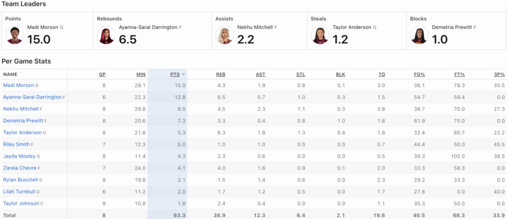 Darrington averages 12.8 points and 6.5 rebounds per game, and she’s very efficient when it comes to putting the ball in the hoop. She’s shooting 54.7% from the field on the year. However, fellow forward Demetria Prewitt, who puts up 7.3 points per contest, is shooting 61.9% from the field. But that’s about it as far as gifted scorers goes on this team.