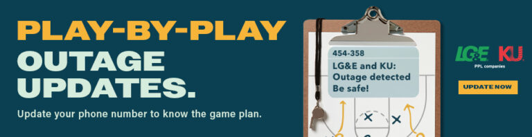 LG&E and KU knows that when the lights go out, it can feel like a full-court press. But staying in the know is an easy win. Update your phone number in the LG&E and KU mobile app or in My Account. If the power goes out, you’ll get play-by-play texts from 454-358 with outage updates, safety information, and time estimates for power restoration. Can’t text? No problem. We’ll call the landline on your account with the same updates so you’re never left in the dark.
