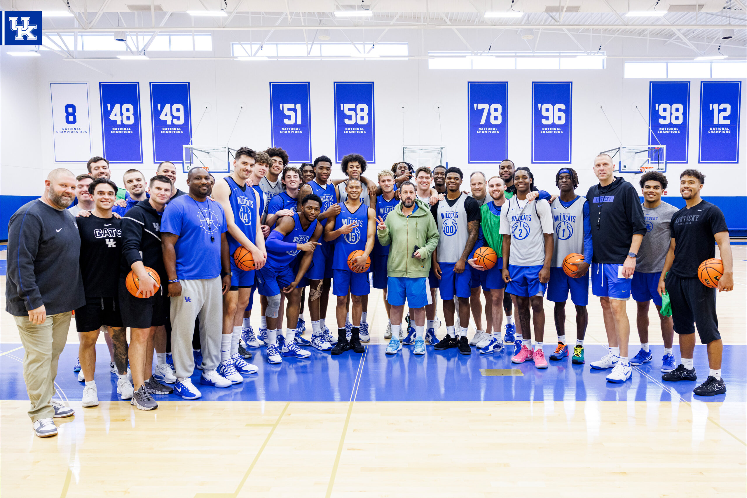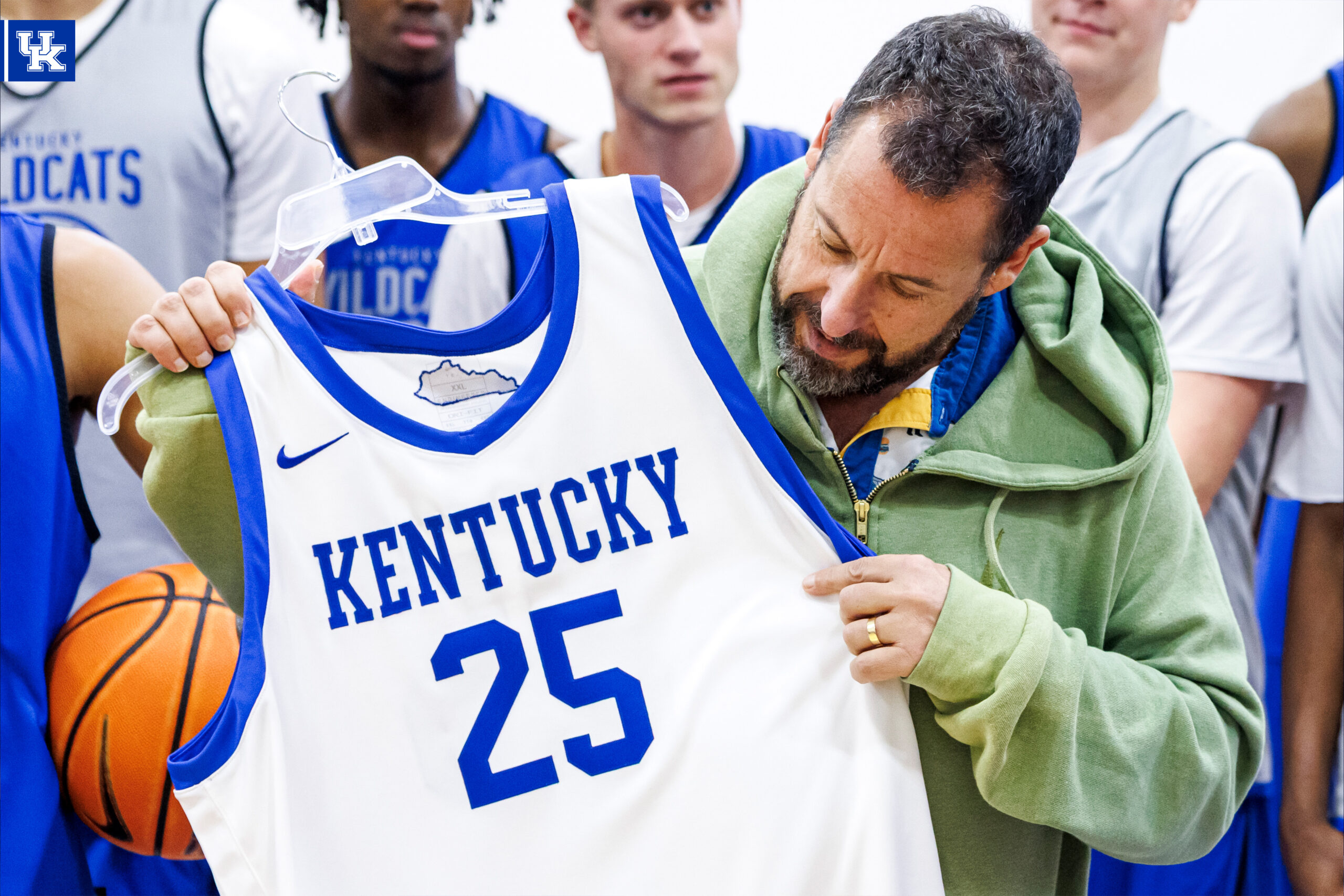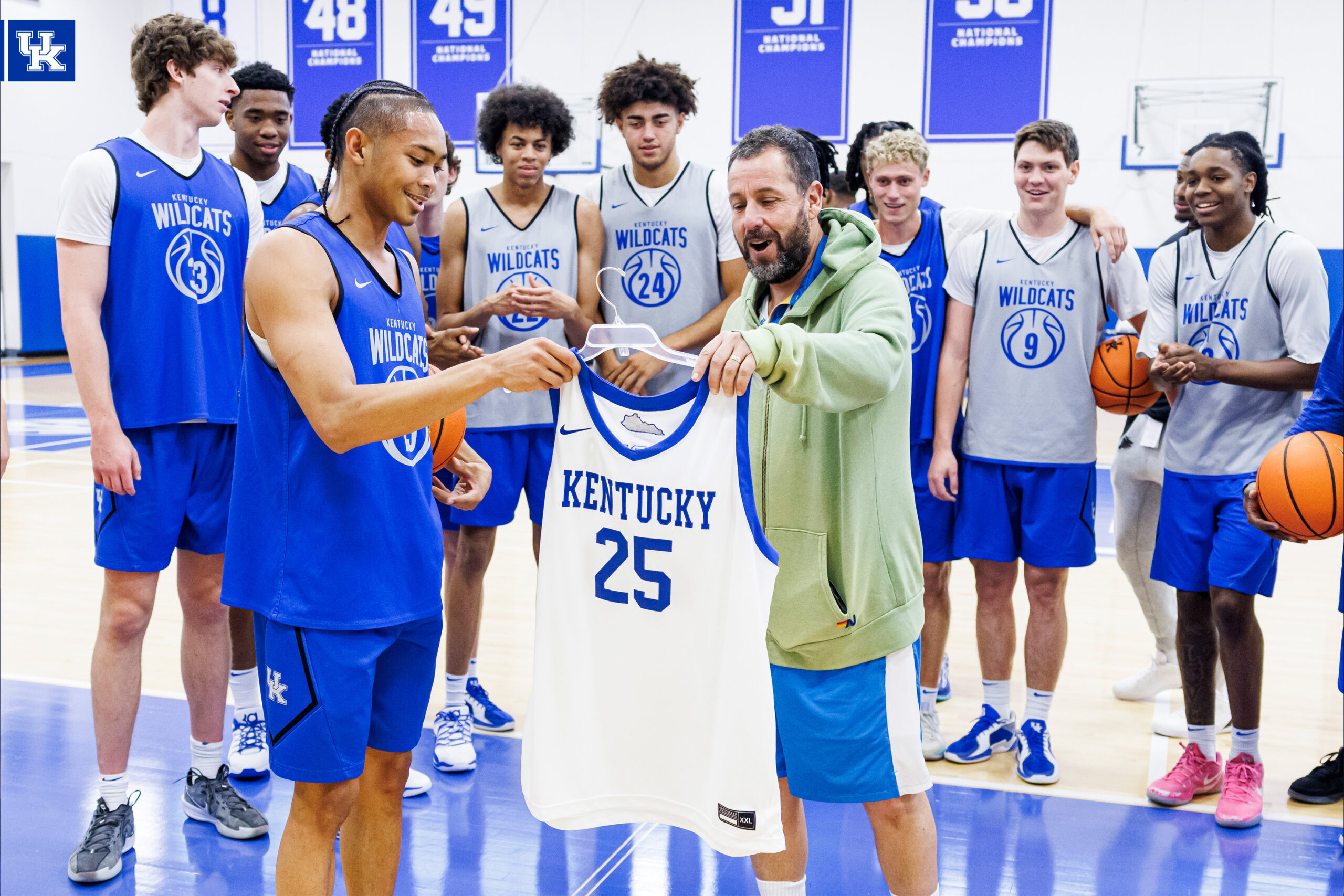 Yes, you did hear incoherent noises coming from the Joe Craft Center on Thursday as the Wildcats were preparing for the Blue-White Game. The Sandman was in town for a show and stopped by the men’s and women’s basketball practices to say hello, with the program gifting him a customized Adam Sandler Kentucky jersey, rocking No. 25 in the blue and white.