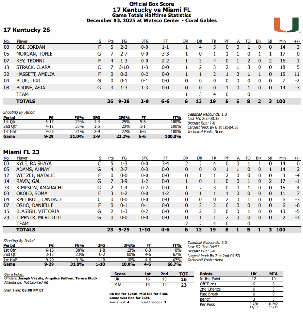 12/03/2025 04:52:46 PMBoth teams are 9-29 (31%) from the field. It’s been about as equal as it can get thus far. Some ugly basketball being played in Coral Gables.