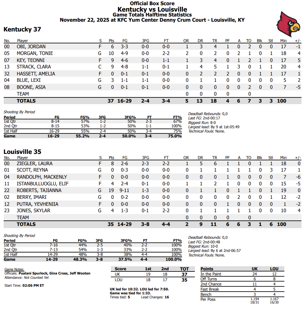 11/22/2025 01:24:07 PMAs expected, we’ve got a back and forth affair here in the Yum. A 10-0 Louisville run late in the first has them in the game right now.