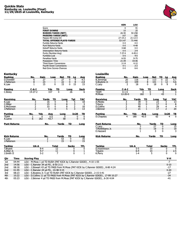 Louisville had a skeleton crew on offense, without a scholarship running back and their leading receiver, but it didn’t matter. The Kentucky offense was lifeless on offense for most of the frigid afternoon at L&N Stadium. During one stretch, the Wildcats netted zero yards on five possessions. When the dust settled, Louisville was hoisting the Governor’s Cup after a 41-0 victory.