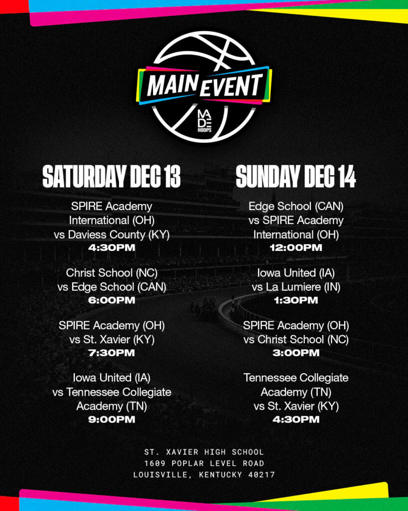 MADE Hoops, the “grassroots leader in cutting edge youth basketball events and experiences,” is hosting its 2025 Main Event at St. Xavier High School in Louisville, KY. It features eight games over the weekend with high school basketball teams from all over the country, and even Canada!