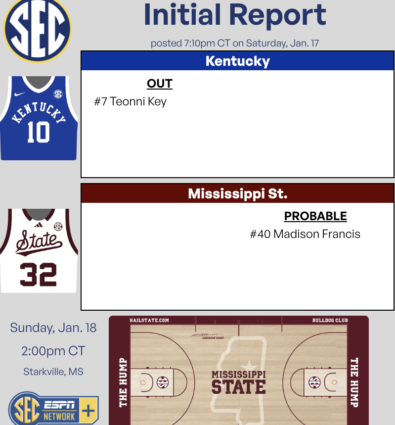 | Humphrey Coliseum (Starkville, MS) | 3 p.m. ET | SEC Network+ (Will Kollmeyer and Brittany Lange) | 630 WLAP, 790 WKRD (Darren Headrick) | StatBroadcast |
