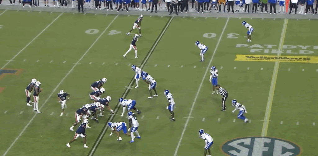 Kentucky shows a six-man front against 11 personnel with three down and three linebackers. Both safeties are in the box and less than 10 yards off the line of scrimmage. Each cornerback is eight yards off the line of scrimmage. That should tell the quarterback that a blitz is coming. The Cats then reveal man coverage when safety Jordan Lovett (No. 25) follows Auburn tight end Preston Howard in motion. Kentucky’s pre-snap design helps create a win.