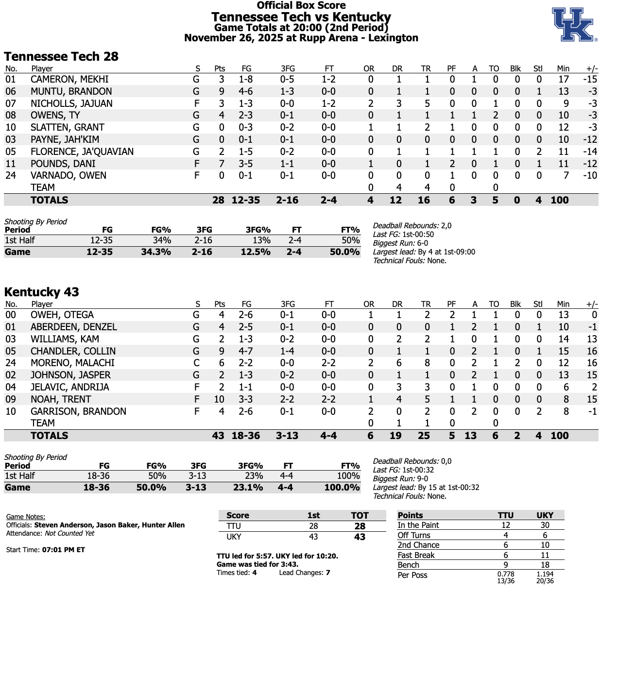 This group went on a 20-3 run while scoring eight of its last 10 field goals down the stretch. Tennessee Tech, meanwhile, missed 10 of its last 11 and is now shooting 34.3 percent from the field and 12.5 percent from three. On the other end, UK is now up to 50.0 percent overall and 23.1 percent from deep after the head-scratching first 14 minutes.