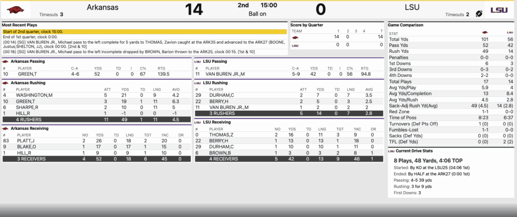 11/15/2025 12:28:02 PMDown 14-0 to start the second quarter, the Tigers needed just six seconds to cut into the lead. LSU put together an impressive nine-play, 75-yard touchdown drive that culminated in a 27-yard rushing touchdown by Caden Durham. Both Durham and Harlem Berry carried the football and caught passes out of the backfield on the drive, which helped Van Buren settle in enough to also hit also hit on a pair of short passes to wide receiver Zavion Thomas. With the extra point from Damian Ramos, LSU trimmed the deficit to 14-7.