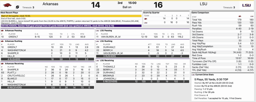 11/15/2025 01:23:12 PMArkansas took a 14-0 lead in the first quarter, but LSU used four drives in the second quarter to grab 16 points and the lead. The Razorbacks were driving for points in the final minutes before halftime, but LSU star cornerback Mansoor Delane’s interception in the end zone ended the threat. With LSU’s defense forcing three turnovers in the first half, the offense found a way to steal points thanks to back-to-back runs by Caden Durham and Harlem Berry. With the ball in Arkansas territory, LSU used a pass interference and a first down throw from Van Buren to Zavion Thomas to get into field goal range. And for the third drive in a row, kicker Damian Ramos converted on his field goal attempt to give LSU the lead. On a drive that started with less than 40 seconds on the game clock, LSU needed just 30 seconds and five plays to go 55 yards and grab the halftime lead.