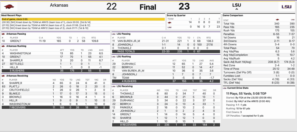 Then, a missed field goal by Arkansas gave LSU the ball back with more than five minutes left in the game. From there, the Razorbacks would never get it back.