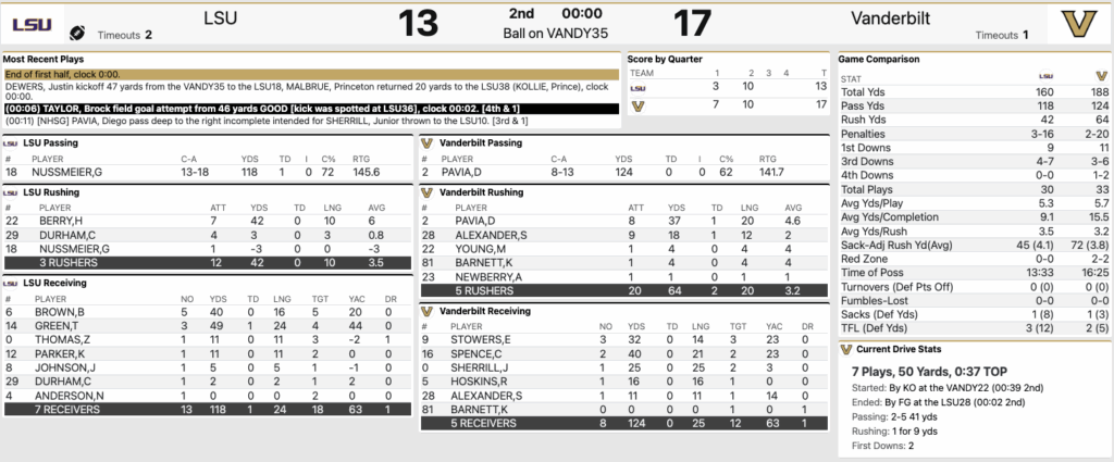 10/18/2025 12:40:30 PMLSU’s 52-yard field goal attempt went wide right with 2:33 left until half, but Vanderbilt wasn’t able to capitalize on the field position. Instead, the Commodores chose to go for it on fourth down on their own side of the field, and LSU linebacker West Weeks came up with a timely sack on quarterback Diego Pavia to force the turnover on downs. LSU was able to convert a 42-yard field goal to cut the lead to one point, but the Commodores came up with a few big plays to get into field position and answer with a field goal on a drive that went 50 yards on seven plays in just 37 seconds. The Tigers fielded the squib kick with two seconds remaining before being tackled as time expired on the first half of a 17-13 game.