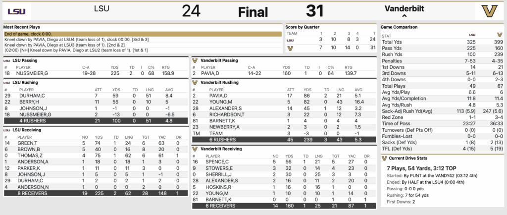10/18/2025 02:24:38 PMBoth teams swapped punts to close out the final 10 minutes of the game, but it was Vanderbilt’s offense – as had been the case seemingly all game – that got the big play to seal the win. Vanderbilt was able to kneel the ball out after the two-minute warning and secure the 7-point win over LSU on a day that played out opposite of each of LSU’s first six games. The offense, this week, stepped up and delivered points on the opening two drives of the game and cut the lead down to three points in the third quarter, while the defense – LSU’s strength all season – was unable to get stops on Vanderbilt and quarterback Diego Pavia in a game when the Commodores scored more than 30 points and kneeled the ball out from the goal line to get the victory.