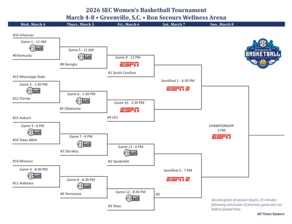 LSU is set to play on Friday at 2:30 p.m. ET against the winner of Oklahoma vs Florida/Mississippi State on ESPN. As the No. 4 seed, the Tigers would likely face No. 1 South Carolina on Saturday at 5:30 p.m. ET on ESPN2 with a win. Here is a look at the bracket. All games are in Greenville, South Carolina.