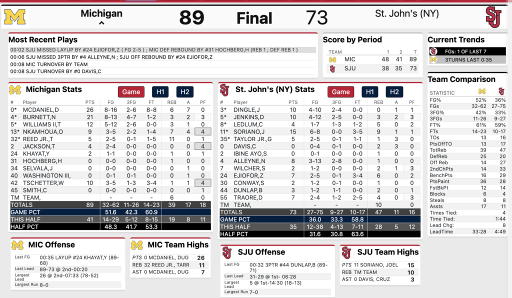 Michigan kept its momentum going in the second half, with a stranglehold on the game it wasn’t willing to give up. The Wolverines continued to score at a high rate, with McDaniel being the catalyst. He scored 6 points in the first five minutes of the half and dished out 2 assists in the first seven minutes. St. John’s went with its press early in the half, but he completely controlled it and even went coast to coast for a layup past the entire defense on one play.