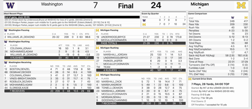 Washington’s next drive lasted only 10 seconds, with Williams throwing his third interception of the day, this time to sophomore defensive back Jacob Oden, who literally had it fall in his lap at the U-M 30-yard line. Michigan took over with 4 minutes to go from that spot. The Wolverines ran out the clock and finished the game in victory formation.