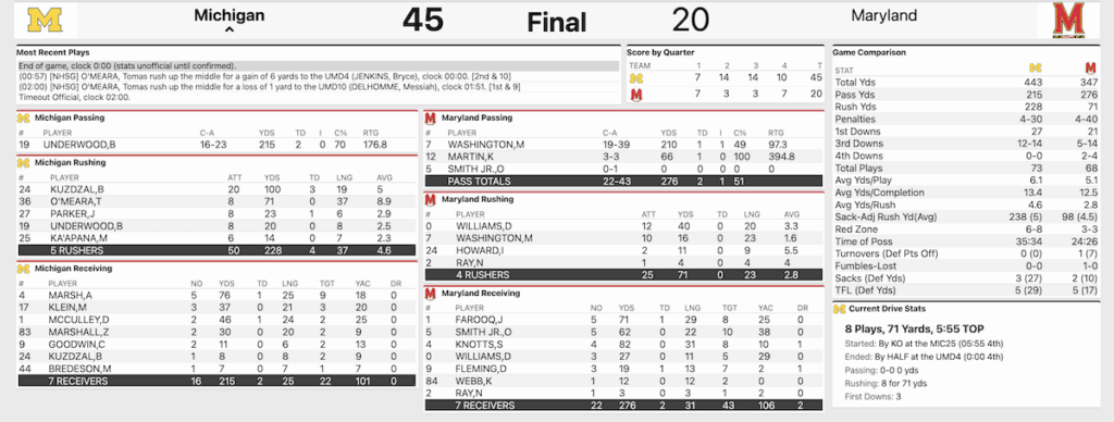 The Michigan Wolverines moved to 9-2 (7-1 Big Ten) with a 45-20 win at Maryland on Saturday afternoon, grabbing a road win in the penultimate game of the regular season and setting up another classic next week.