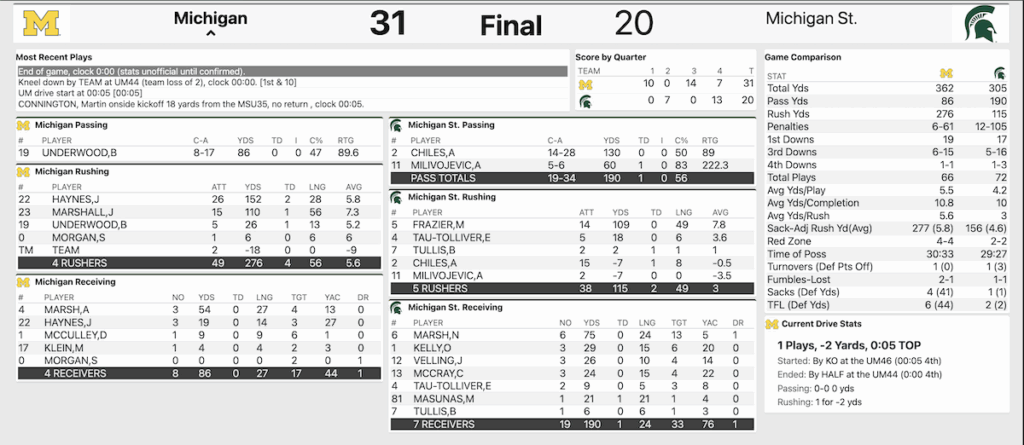 EAST LANSING – The Michigan Wolverines beat the Michigan State Spartans 31-20 on Saturday night, winning their sixth game of the season and their fourth in a row over their in-state rival.
