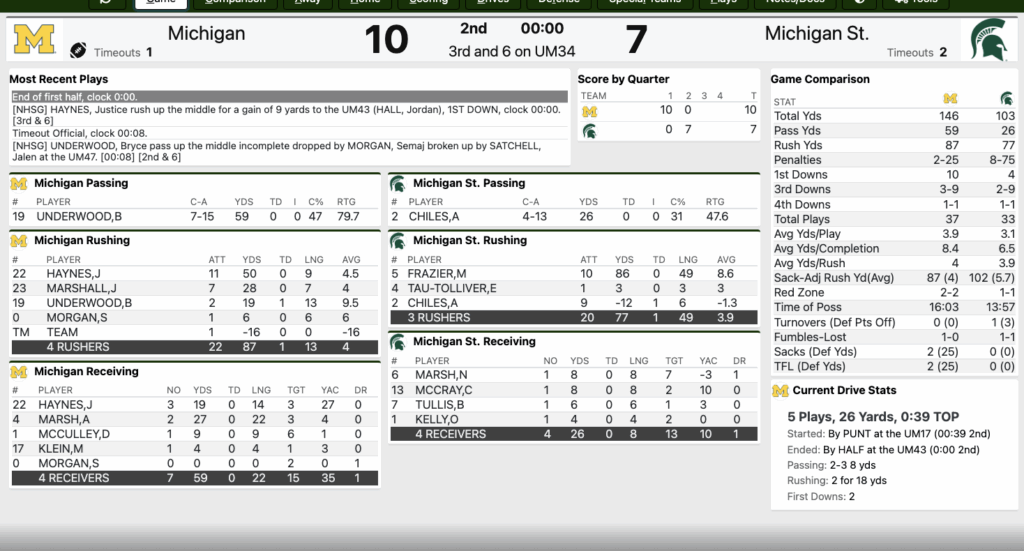 10/25/2025 07:51:20 PMMichigan State has had the ball for the entire second quarter to this point, with Aidan Chiles capping off a 10-play, 73-yard drive that spanned 6:36 with a 1-yard touchdown run on a quarterback sneak. The drive was highlighted by a 49-yard run from Makhi Frazier down to the Michigan 25-yard line.