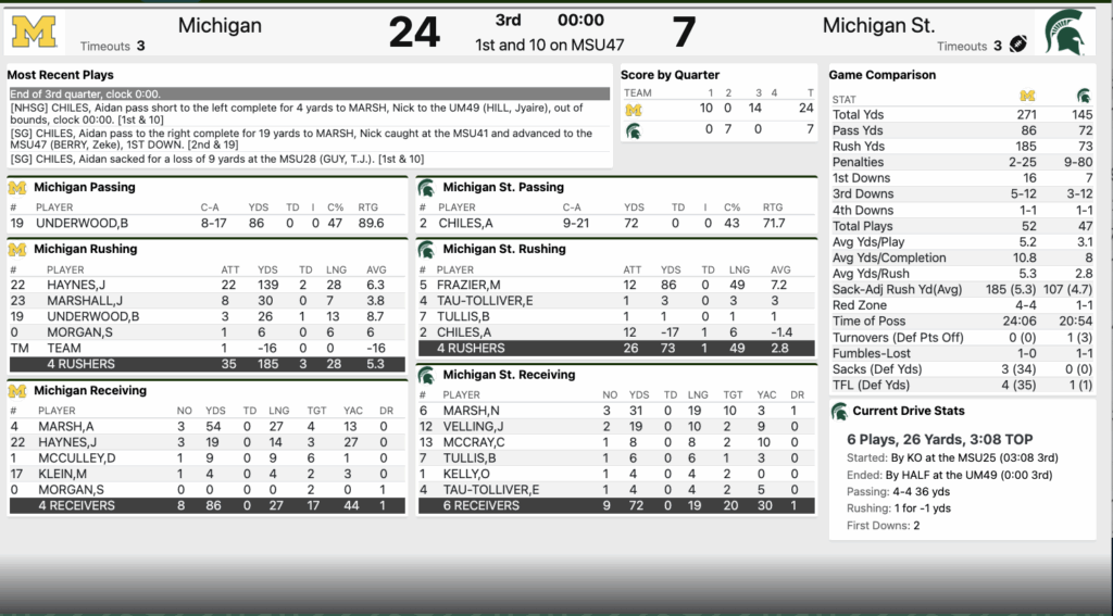 10/25/2025 09:30:39 PMMichigan State responded to the Wolverines’ score with one of their own, going 75 yards to make it a 10-point game. Aidan Chiles went deep to Nick Marsh for a 24-yard gain to the half-yard line. On the next play, Brandon Tullis ran up the middle for a score. Michigan’s lead is now 24-13 with 12:34 to go in the game, following a failed two-point conversion. The Spartans are hanging around.