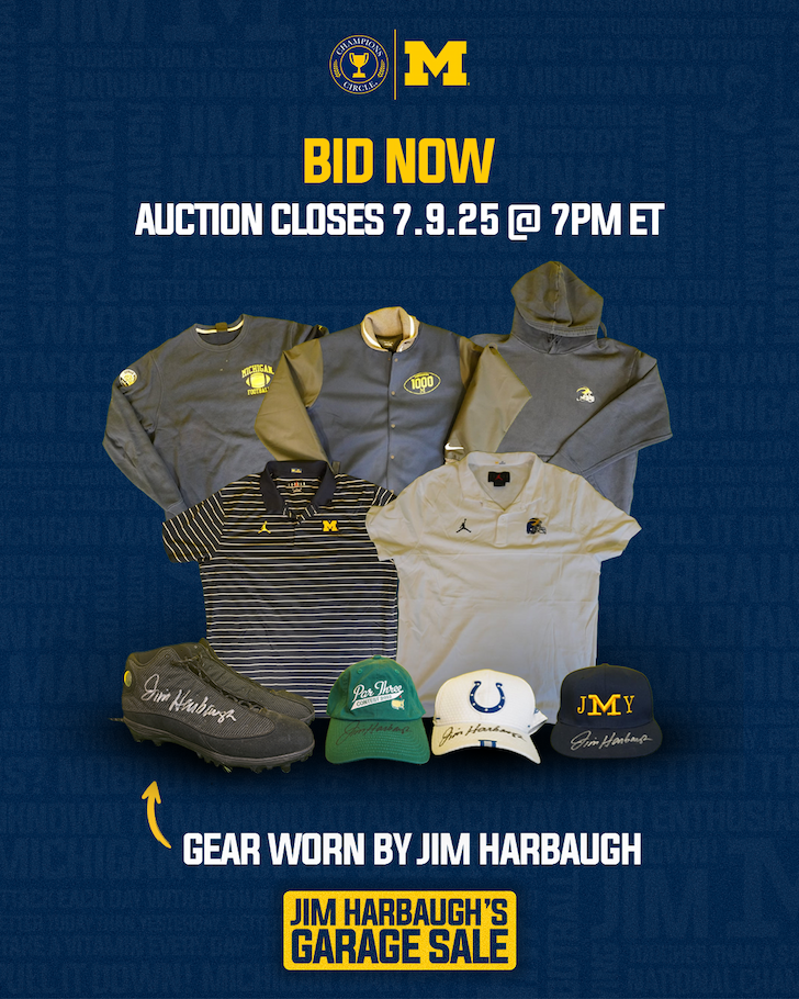 Michigan Wolverines football‘s primary collective, Champions Circle, is holding an online ‘Garage Sale’ auction featuring game-worn gear from former All-American quarterback and head coach Jim Harbaugh, who’s now the head man of the NFL’s Los Angeles Chargers.