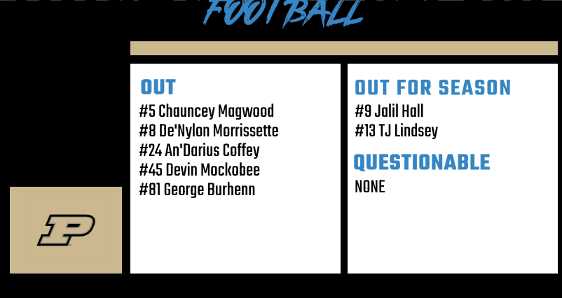 11/01/2025 05:15:24 PMPurdue starting running back Devin Mockobee is out for today’s game.