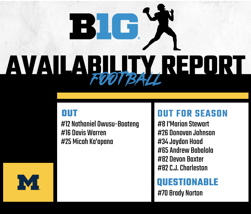 Right guard Brady Norton is warming up — he’s listed as questionable on the availability report. It’s worth noting, however, that he may not even be a starter, since sophomore Jake Guarnera has played well in his replacement.