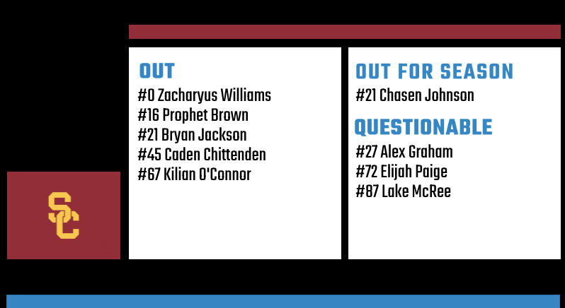 10/11/2025 04:54:23 PMFrom WeAreSC’s Erik McKinney: “Tight end Lake McRee also listed as questionable today (in addition to Elijah Paige). That’s a surprise. [We had] no sense that he’d been limited at all. Will be worth watching during warmups.”