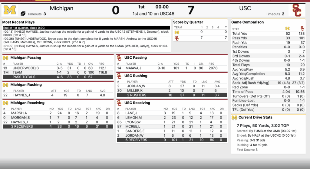 10/11/2025 07:20:09 PMMichigan had 3rd and 4 from the USC 28-yard line on its second offensive possession that went from the end of the first quarter to the beginning of the second. But Marlin Klein false started, then Bryce Underwood took a sack for a loss of 11 yards — pushing the Maize and Blue out of field goal range. Hudson Hollenbeck punted and pinned USC back at its own 10-yard line. The Trojans lead 7-0 with 11:57 to go in the second quarter.