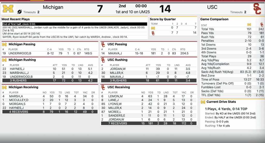 10/11/2025 07:59:47 PMUSC executed a two-minute drive and scored a touchdown to go up 14-7 with 14 seconds to go in the first half. Michigan was in man-to-man coverage, and Jayden Maiava found Makai Lemon for a touchdown over freshman cornerback Jayden Sanders from 12 yards out.