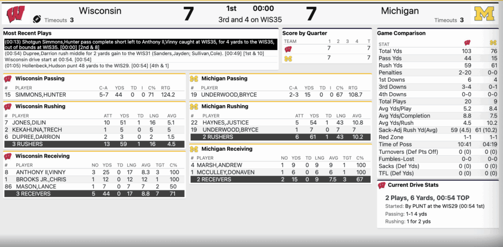 10/04/2025 11:18:47 AMWisconsin got the ball first and drove right down for a score, 75 yards on 12 plays, spanning 6:50. The Badgers lead 7-0 with 8:10 remaining in the first quarter. The touchdown was a 5-yard run by Dilin Jones. Wisconsin racked up 39 rushing yards on 9 carries (4.3-yard average).