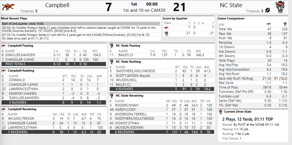 10/04/2025 01:14:30 PMTeddy Hoffman tried to return a punt — he fair caught all four last week — but didn’t secure it all the way. Fumble recovered by Campbell at the NC State 10-yard line.