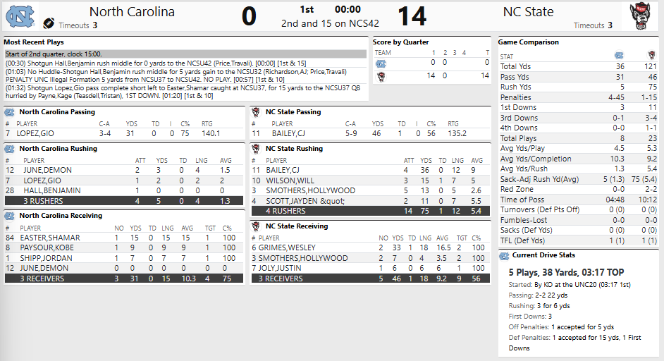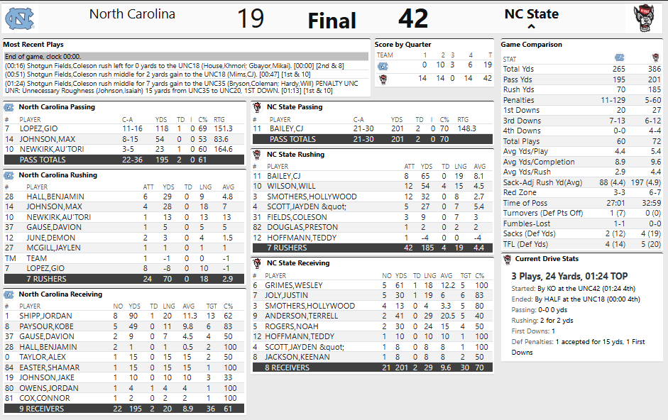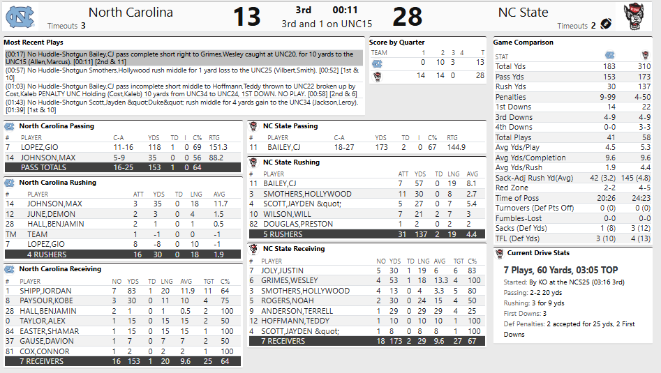 11/29/2025 06:44:08 PMNC State used a methodical drive to work its way down the field — including a 4th-down conversion — to cap it with a 15-yard touchdown pass from CJ Bailey to Wesley Grimes.