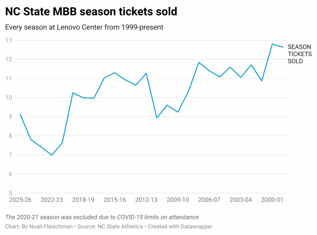 Even after winning the ACC Tournament and making a trip to the Final Four in 2024, NC State sold just 7,808 season tickets for the 2024-25 campaign. While it was lower than before the pandemic, those sales marked the most since the world was flipped upside down by the unprecedented illness.