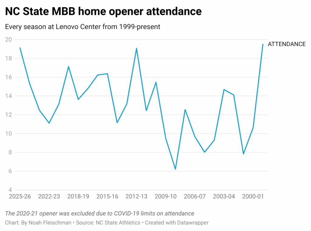 After selling at least 10,000 season tickets in 16 of the first 22 seasons in the Lenovo Center, NC State’s sales dropped under 8,000 in each of the past four years. Part of that has to do with the COVID-19 pandemic as some fans have been cautious to make their return, Corrigan thought, but a combined 72-62 record with just two NCAA Tournament appearances over that stretch of “not the greatest years we’ve had” also seemed to play a role.