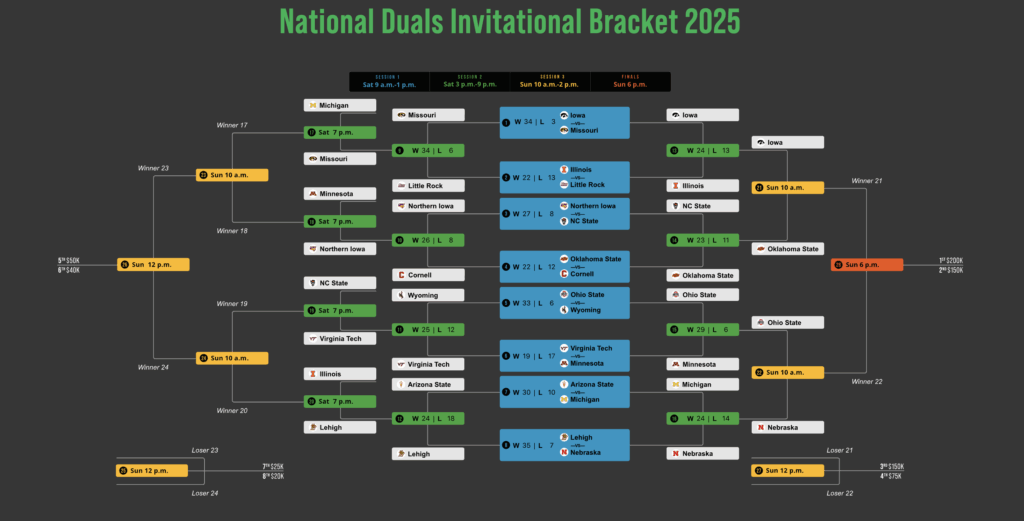 No. 2 Nebraska wrestling (3-0) advanced to the National Duals Invitational semifinal by taking down No. 7 Lehigh 35-7 and No. 10 Michigan 24-14 in Tulsa, Oklahoma, on Saturday. The Huskers faced some upsets in each dual, but were able to remain alive for the $200,000 payout for the tournament winner.