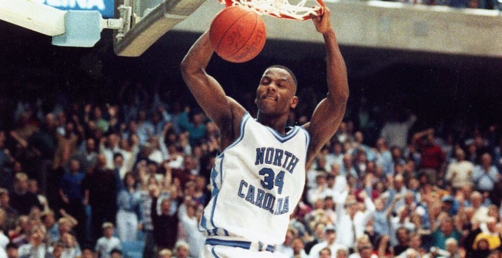 Charlie Ward, Heisman-winning QB in football, lofted a cross-court pass. George Lynch, reading him like a free safety, intercepted at midcourt – Ward’s 10th turnover – and sailed in for a dunk, giving Carolina the lead. This one was over.