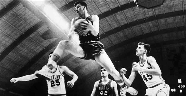 In what is probably still the greatest ACC Tournament in history, Rosenbluth scored 45 in the opening round against Clemson (on 19-of-31 shooting), then 38 versus South Carolina in the title tilt (on 15-of-25 from the field). His hot streak continued in the NCAAT with 29 against Yale in the Round of 32, 39 against Canisius in the Sweet 16, and 23 in the Elite 8 versus Syracuse. In the Final Four, Rosenbluth struggled from the field, shooting 33.3% (including 11-of-42 in the national semis versus Michigan State). But for the entire ’57 postseason, Rosenbluth scored 30.8 PPG on 48.7% shooting, numbers that exceeded his regular-season marks (27.0 and 48.2%). The bomber from the Bronx wasn’t shy about getting his shots up, and his National Player of the Year season in 1957 carried the Heels to an undefeated record and the program’s first NCAA championship.