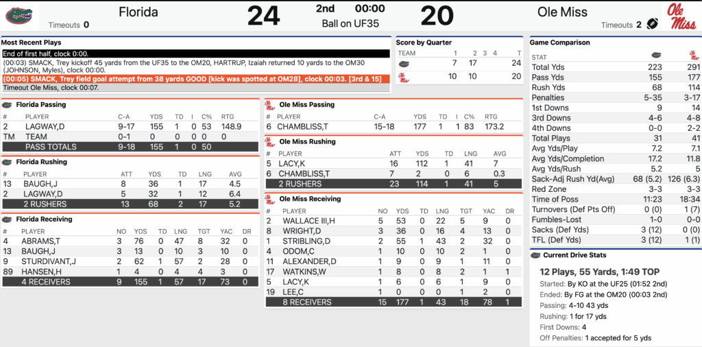 HALFTIME: FLORIDA 24, No. 7 OLE MISS 20