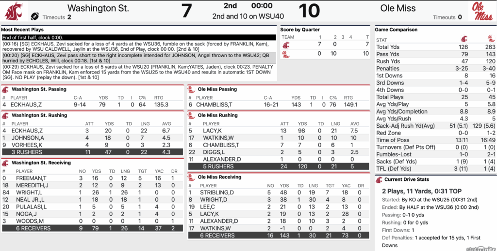 HALFTIME: NO. 4 OLE MISS 10, WASHINGTON STATE 7