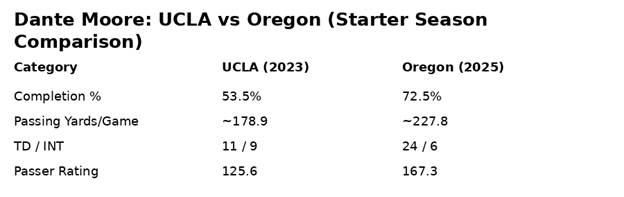 Dante Moore has been markedly better with the Ducks than he was at UCLA. Some of that comes with experience, some with just better overall talent, but the numbers speak for themselves.