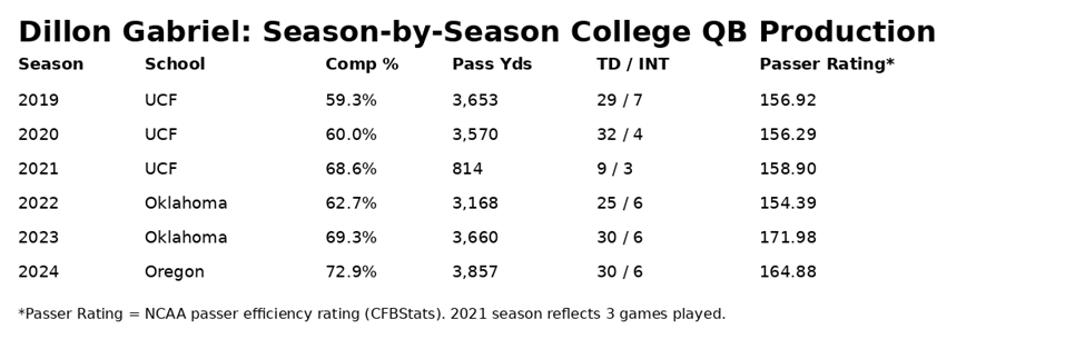Dillon Gabriel arrived as a more finished product. He had been successful at UCF and Oklahoma, and his stats only marginally improved in some areas with the Ducks. Still, Gabriel was able to improve his accuracy while maintaining the same production that he had at Oklahoma.