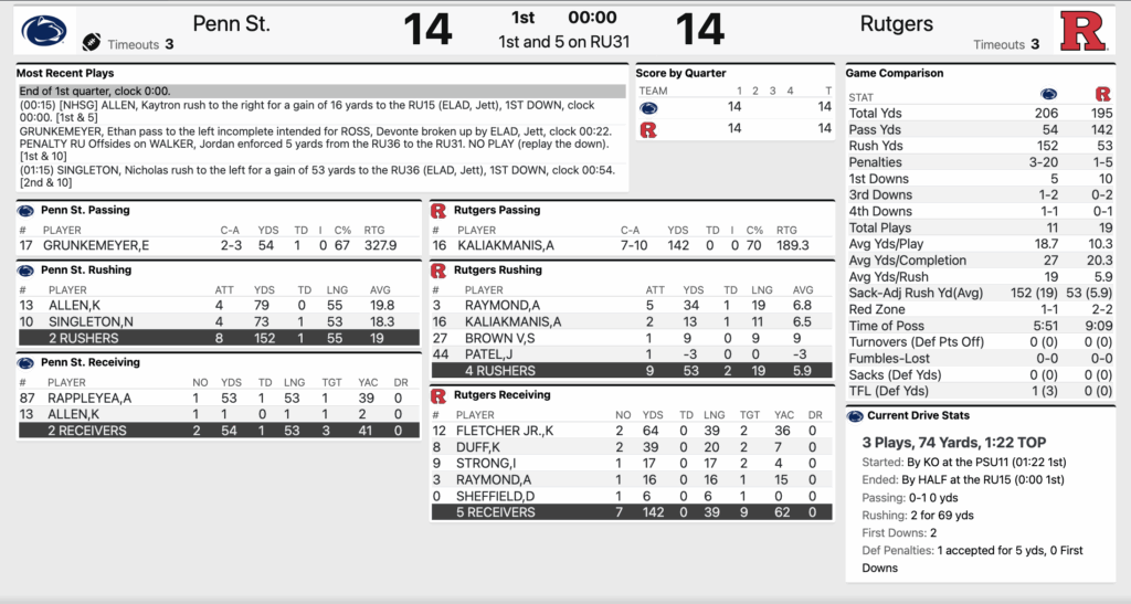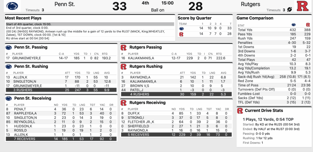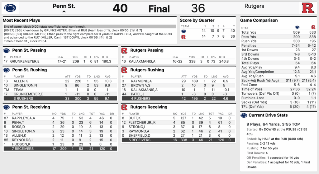PISCATAWAY, N.J. — Penn State takes on Rutgers today in both teams’ regular season finale. A trip to the postseason is on the line when the Scarlet Knights and Nittany Lions, who are both 5-6, meet at 3:30 p.m. inside SHI Stadium. The Big Ten Network is televising the game. And, this is your home for live updates throughout the contest. You’ll find the latest score, stats, and notes below as the game unfolds.