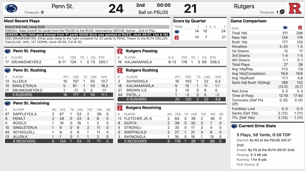 11/29/2025 05:31:37 PMA questionable delay of game penalty on 4th and 1 forces Penn State to punt. Following a 56-yard punt by Gabe Nwosu, Rutgers has the opportunity to make this a two-score game. They’ll start from their own 26-yard line.