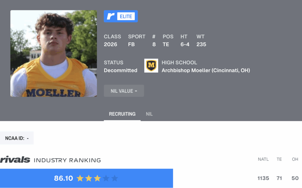 The Ohio native is the 71st ranked tight end and 50th player in the state, according to Rivals. McCutchan held offers from Texas A&M, Wisconsin, Kentucky, Washington, Indiana, Louisville, Houston, Vanderbilt, Pitt, Rutgers, Minnesota, Duke, Georgia Tech, West Virginia, Virginia, Cincinnati, Kansas State and others.
