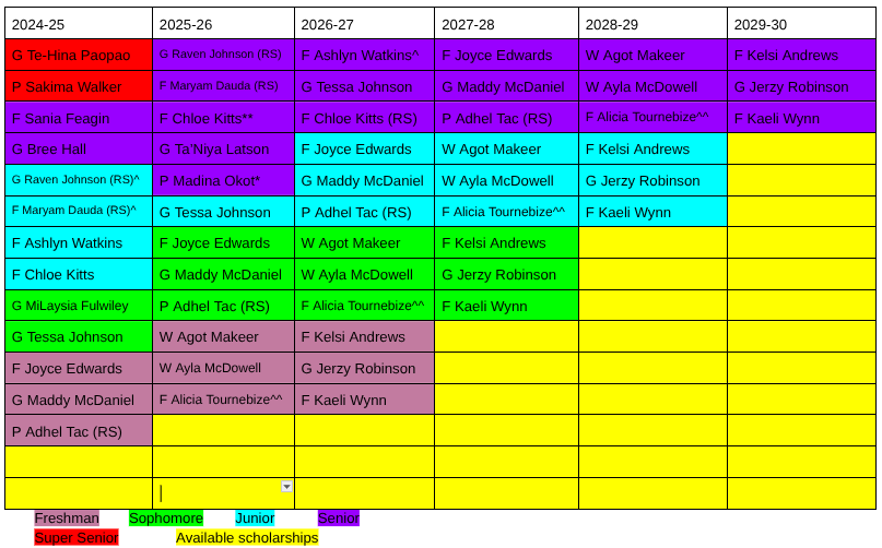 ^ Watkins tore her ACL on January 5, 2025. She played too many games to be automatically eligible for a redshirt. Watkins announced in July 2025 that she will sit out the 2025-26 season and return for the 2026-27 season.