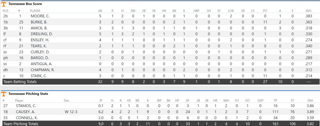 Game 2 – [1] Tennessee 9, [4] Northern Kentucky 3 | Final Stats