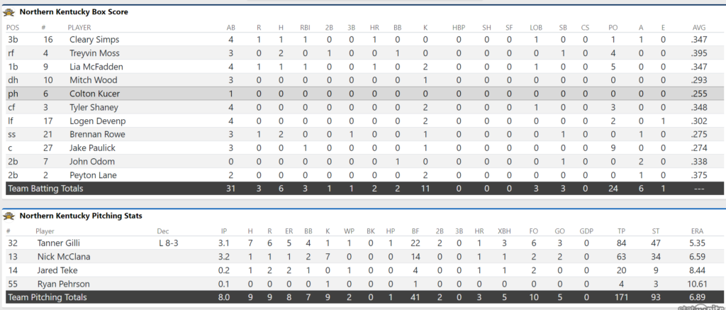 AJ Causey (12-3) earned the victory in relief after tossing 6.2 innings of two-run baseball wit nine strikeouts to only one walk. Northern Kentucky starting pitcher Tanner Gillis (8-3) took home the loss after allowing five runs off seven hits in just 3.1 innings of work.